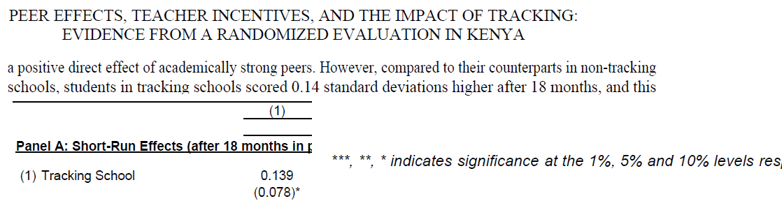 Duflo, E., P. Dupas en M. Kremer, 2011, Peer effects, teacher incentives, and the impact of tracking: evidence from a randomized evaluation in Kenya, American Economic Review, vol. 101(5): 1739-1774.