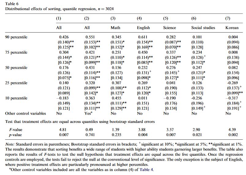 KimThe footnote summarizes the findings. If I understand correctly, the argument is that with controls, column (2) gives the overall effect per quantile of the ability grouping. This is clear: at 1% significant effects for all groups. The F-value at the bottom tests for significant differences, and is not significant (>.1, yes economists use 10%), hence the statement ‘no significant differences’ between different abilities. Based on column (2) one could say that; we could of course also say that a difference of .320SD versus .551SD is rather large. But what’s more interesting, is the pattern of significant effects over the subjects: those are all over the place in two ways. Firstly, in the differential effects on the different ability groups e.g. in English significantly larger positive effects higher ability than lower ability (just look at the number of *), in Korean significantly more negative effects for lower ability. (Note, that I did see that other control variables weren’t included here, I don’t know why, there is something interesting going on here any way, as there are differences first in column (1) but controls in (2) make them non-significant). Furthermore, the F-values at the bottom show that only for maths there are no significant differences, for all the other subjects there are, some quite sizable. What seems to be happening here is that all the positive and negative effects over the ability groups roughly cancel each other out, yielding no significant difference. Maybe they go away when including controls, but that can’t be checked. What is clear, I think, is that there are differences between subjects. I think the conclusion in the abstract “sorting helps students above the median in the ability distribution, and does no harm to those below the median” therefore needs further nuance.