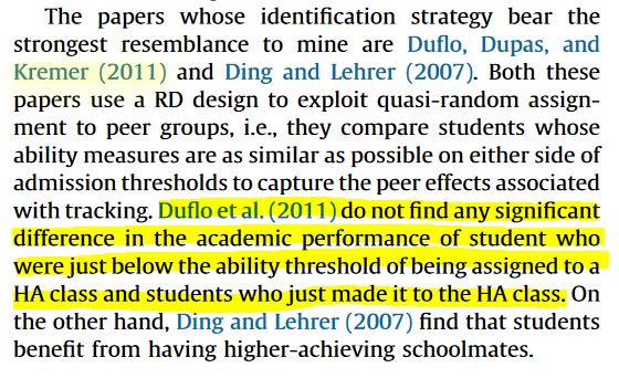 A third paper mentioned in the report is one by Kim et al.. Another context: secondary school, and one set in South Korea. It concludes that: “First, sorting raises test scores of students outside the EP areas by roughly 0.3 standard deviations, relative to mixing. Second, more surprisingly, quantile regression results reveal that sorting helps students above the median in the ability distribution, and does no harm to those below the median.”. As an aside, it’s interesting to see that the paper had already been on SSRN (now bought by Elsevier) since 2003. This begs the question, of course, from what year the data is. This always is a challenge; peer review takes time and often papers concern situations from many years before. In the meantime things (including policies) might have changed.