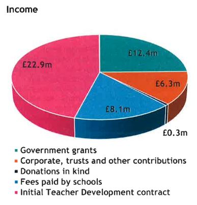 If we now also take into the direct costs to school, the upfront recruitment fee of 4k then it seems that the ‘voluntary contribution per trainee’ is rather low. Of course what is difficult is to unpick what money is actually used internally for what, so let’s also look at the total income of Teach First for 13-14 and 14-15 respectively (this is the 2014-2015 year report for Teach First):