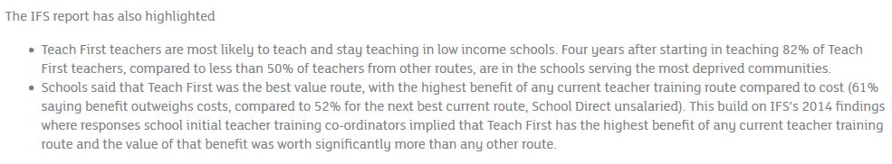 Of course Teach First also had their own series of press releases. Understandably they liked to stress the ‘leadership’ aspect more than cost and retention. But they also had a post asking for more investment in research into teaching training routes. I thought the press release was a bit too defensive, to be honest. It starts off with basically saying that the comparison had not been fair, in my view surprising because previously -when the IFS had used an in my view strange way to calculate Teach First’s larger benefits– there had been no complaints about that. Towards the end it actually is repeated.