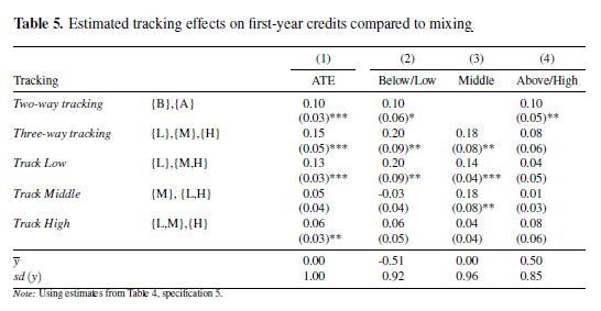 This is roughly the same as what is described in the article on page 20. The paper then also addresses average grade and dropout. Actually, the paper goes into many more things (teachers, for example) which I will not cover. It is interesting to look at the conclusions, and especially the abstract. I think the abstract follows from the data, although I would not have said “students of low and medium ability gain on average 0.2 SD units of achievement from switching from ability mixing to three-way tracking.” because it seems 0.20 and 0.18 respectively (so 19% as mentioned in the main body text). Only a minor quibble, which after querying, I heard has been changed in the final version. I found the discussion very limited. It is noted that in different contexts (Duflo, Carrell) roughly similar results are obtained (but see my notes on Duflo).